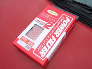 んで、部屋の中に居てHDDばっかり構ってるのもアレなので、今日は赤い隕石号を構う事に。以前書いた通り、排気系(マフラー)をやったら今度は吸気系をやんなきゃね。ってことで、エアクリーナーの交換を実施。純正のエアフィルター、ものすごい汚れてるしね。