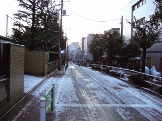 車道は若干のわだちが出来る程度で、歩道の雪はシャーベット状。歩く分には問題ないけど、ところどころ凍結してる部分もあった。