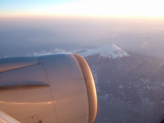 夕陽とシルエットになった富士山がものすごくいい景色だったんだけど、残念ながら電子機器ON許可がまだ出てたなったのと、それが出る頃には角度が変わっちゃったので、デジカメに記録することは出来んかった。