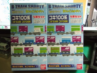 コンテナ貨車コキ100系(104形・106形)4両セット、をふたつ。貨物スキーな後藤としては、買わないわけにはいかんじゃろ。どうでもいいんだけどさ、これ、コンテナもセットで入ってるんだけど、JRFカラーの19A、19B、19Dが入ってるのはともかく、国鉄コンテナのC20、C21、C35、C95が入ってるのは完璧に趣味だろ。