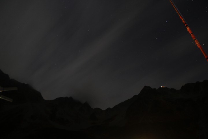 都会から離れて山の中の満点の星空が見えるなーと思って期待してたんですが、涸沢は夕方から雲が流れてきて、翌朝は雨が降ってるような状況。んなわけで、星空もあんまりキレイに見れなかったし、写らなかった。